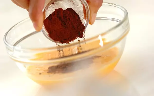 1、ボウルに<ココア卵液>の卵を割り入れて溶き、ココアパウダーを加えてしっかり混ぜ合わせる。続いて他の材料を加え、さらに混ぜ合わせる。