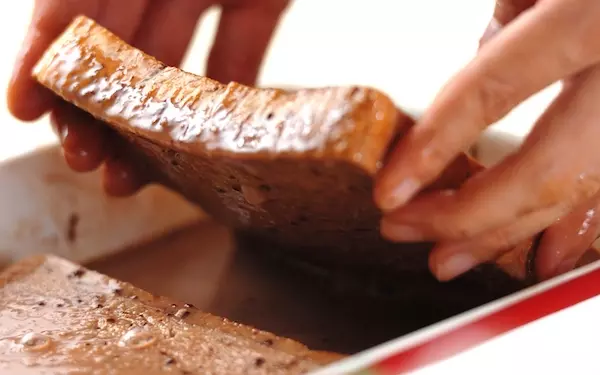 2、食パンが入る容器に<ココア卵液>を移し、食パンを入れ、何度か返しながらしみ込ませる。