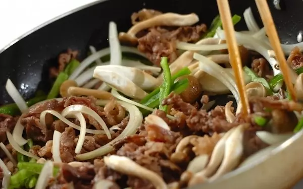 1、フライパンにゴマ油を中火で熱して牛肉を炒め、色が変わってきたら玉ネギ、シメジ、ピーマンを加えてさらに炒める。