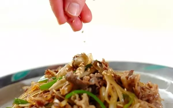 2、全体に火が通ったら春雨を加えてさらに炒め、全体に味がからんだら器に盛り、白ゴマを散らす。