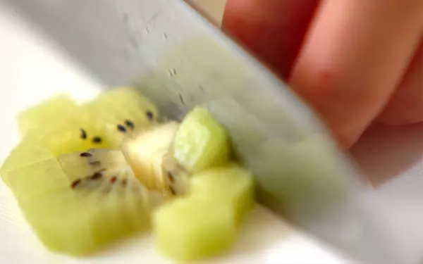 1、粉ゼラチンは水に振り入れてふやかしておく。キウイは皮をむき、5mm角に切る。