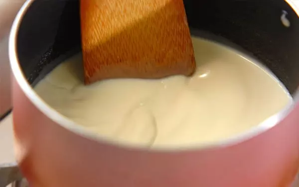 2、鍋に生クリーム、牛乳、練乳を入れて火にかける。沸騰させないように注意しながら、練乳が溶けたら火を止める。