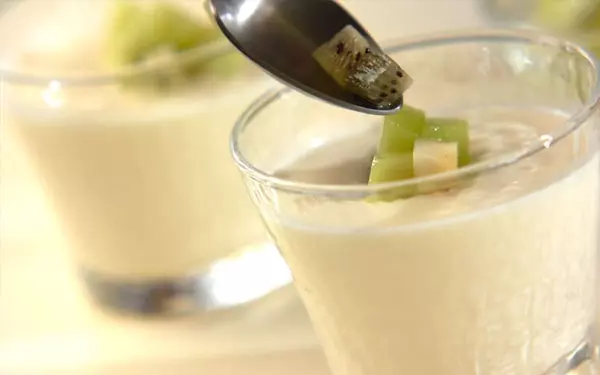 4、ボウルに氷水をあて、トロミがつくまでゴムベラ等で混ぜ合わせる。器に流し入れて冷蔵庫で冷やしかため、キウイをのせる。