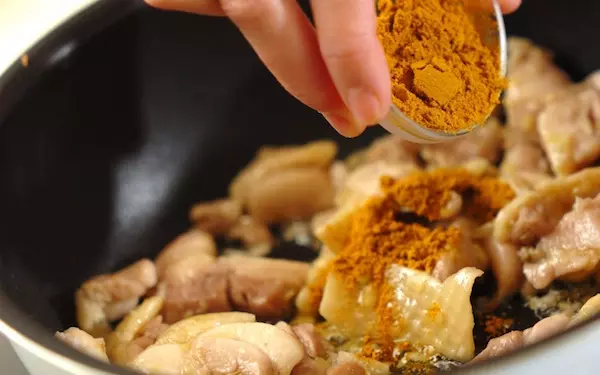 2、フライパンにサラダ油を熱し、鶏もも肉、ニンニク、ショウガを炒め合わせる。香りがたったらカレー粉を加えて炒め合わせ、トマト、<スープ>の材料を加え、フライパンに蓋をして10分煮る。