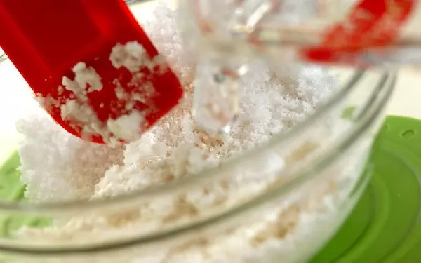 1、耐熱ボウルに白玉粉と砂糖を入れ、水を2~3回に分けて加え、その都度ゴムベラで白玉粉の粒がなくなるまでよく混ぜる。
