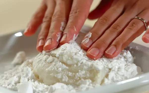 3、バットに片栗粉を広げ、(2)を流し入れてさらに片栗粉をまぶし、しっかりと粗熱を取る。人数分に分ける。