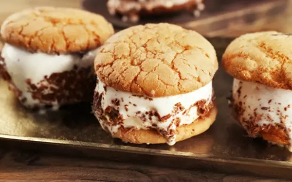 シャーベット系よりも、濃厚なミルクベースのほうがマッチします。冷凍庫から出したらすぐに使わずに、少しやわらかくなってからのほうが挟みやすくなります。