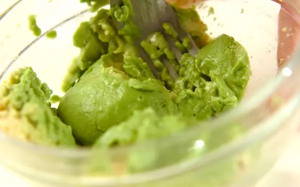 ・アボカドは包丁を縦に入れ、種まで深く切り込みを入れ、両手でひねるように半分に分ける。種を取り、果肉をスプーン等で取り出しボウルに入れ、レモン汁をからめフォークの背でつぶす。