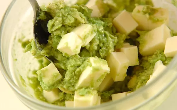 1、ボウルにアボカド、プロセスチーズ、塩コショウを入れて混ぜ合わせる。