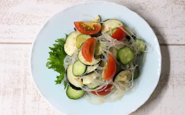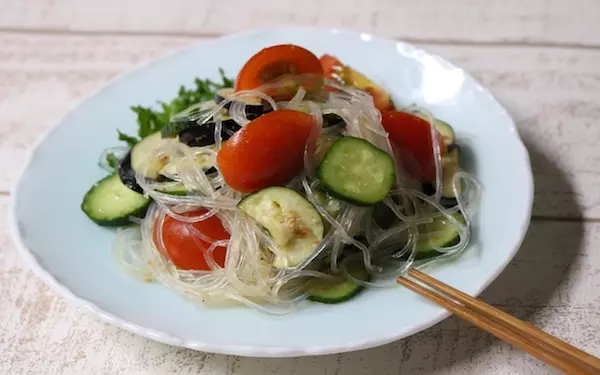 「夏野菜のごまポン酢どんぶり」の具を多めに仕込んでおけば、翌日も食べることができます。できたてはサラダ風ですが、しばらくポン酢に浸しておくと、味がしみて濃厚な味が楽しめますよ。●アレンジ1 野菜たっぷり春雨サラダ