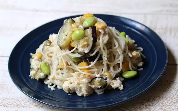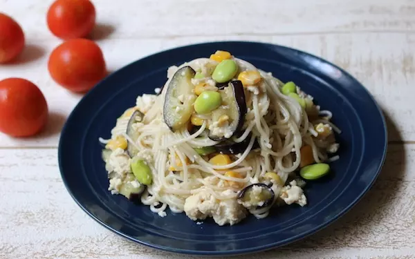 家にある野菜と豆腐で作る、ボリューム満点なそうめんチャンプルー。カラフルな彩りの野菜を選ぶと、見た目にも楽しくなりますよ。
