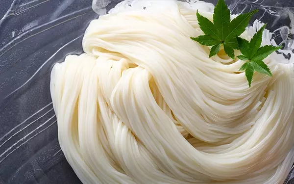 そして、そうめんをゆでたら流水にさらし、ぬめりを取ります。ザルにあげてしっかり水気を切ったら、オイルをまぶしておくのがコツ。そうめんの一本一本が油でコーティングされ、くっつきにくくなります