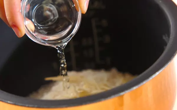 1、炊飯器に洗ったお米、ショウガ、<調味料>の材料を入れ、さらに通常に炊く水量線まで分量外の水を加え、スイッチを入れる。