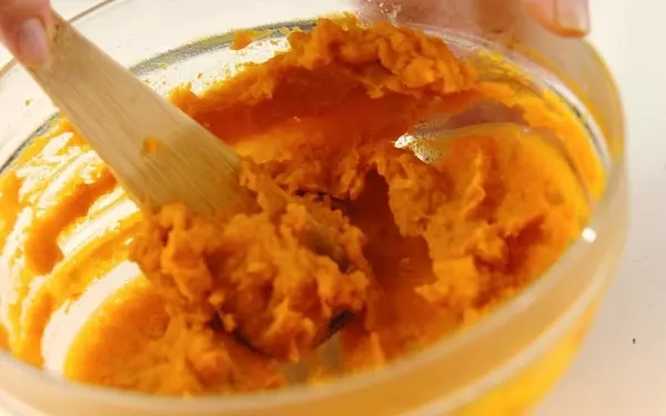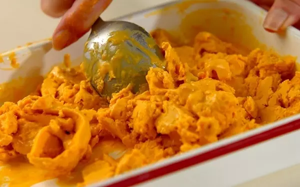 1、カボチャが温かいうちに、砂糖、卵黄を加えて混ぜ合わせ、なめらかになったら、生クリームを加え混ぜ合わせる。