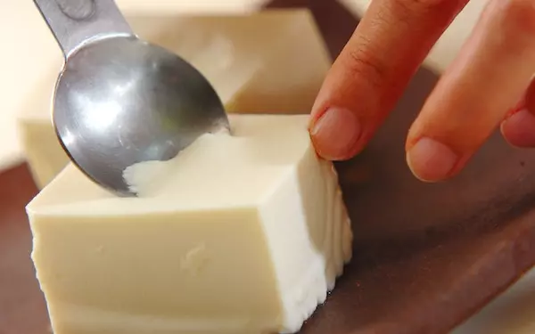 2、豆腐は半分に切り、スプーンで上を丸く削り、<しょうゆ卵>の置き場所を作る。