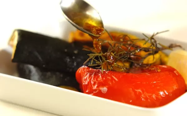 2、表面にこんがり焼き色がつくまで焼く。器に焼き野菜を並べ、ローズマリー、レモンを添え、<合わせソース>をかける。