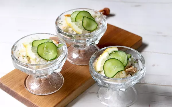 女の子は特に、見た目も大切。パフェグラスに「鮭ときゅうりのさっぱり混ぜご飯」を入れてみました。パーティではカップ寿司をたくさん並べるとかわいいですよ。