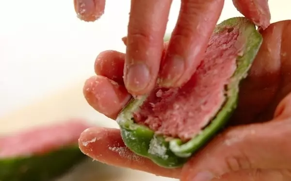 コツ・ポイント ピーマンから肉ダネが外れることを防ぐために、返す回数は少なめにしてください。