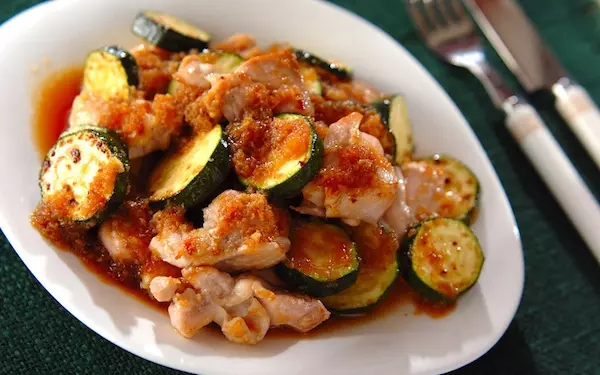 ニンニク1片をまるまるすりおろし、玉ネギや白ワインを混ぜて作る和風ガーリックソースが決め手のこのレシピ。素材はシンプルに鶏もも肉とズッキーニのみです。