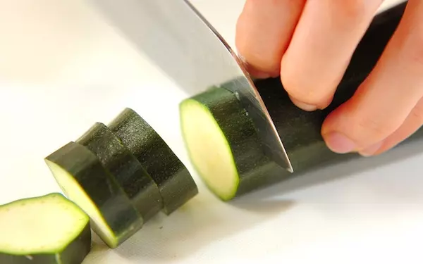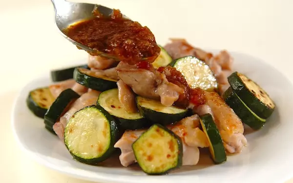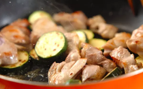3、同じフライパンにズッキーニを並べ、返しながら焼く。塩で味を薄く調え、(2)の鶏もも肉を戻し入れて炒め合わせ、器に盛る。