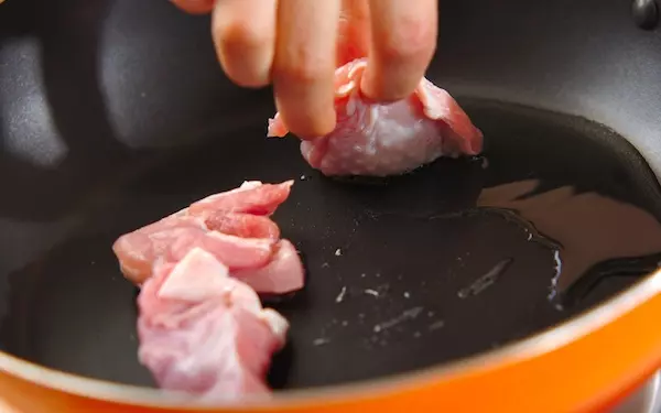 2、フライパンにサラダ油を強火で熱し、鶏もも肉の皮を下にして並べ入れる。焼き色がついたら弱めの中火にして返し、中まで火を通していったん取り出す。