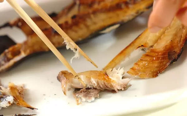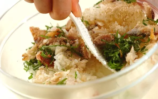 1、グリルを予熱し、アジの干物を焼いて取り出し、粗熱が取れたら身をほぐす。梅干しは種を取り除いて刻む。大葉は軸を切り取って細切りにする。