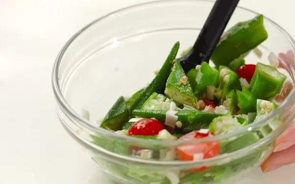 1、ボウルにオクラとプチトマト、白ネギを入れ、<調味料>の材料を加え、和えて、器に盛る。オクラの下ゆでは加熱のしすぎに注意しましょう。