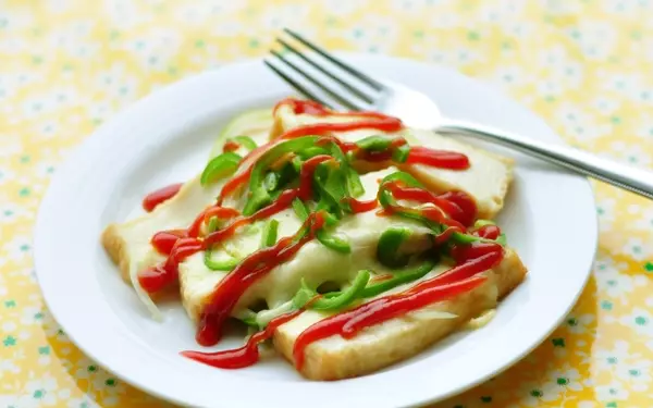 3、厚揚げに塩をふり、たまねぎ、チーズ、ピーマンの順にのせ、ふたをしてチーズが溶けたら器に盛る。