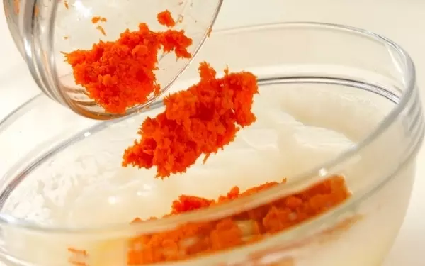 2、<生地B>の材料をしっかり砂糖が溶けて乳化するまで混ぜ、ニンジンを入れてさらに混ぜる。<生地A>を加えてさらに混ぜ、型に流し入れる。