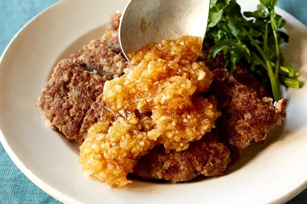 たねを丸めている時間がないときは、焼いてから切れば時短に。また玉ねぎソースはサラダなどにも活用できる、万能ソースにもなります。
