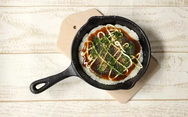 「ごはんピザ」の生地をフライパンで焼いてウスターソースとマヨネーズ、おかかと青のりをかけたら、お好み焼き風ピザのできあがり! ピザでもない、お好み焼きでもない、新しいおいしさです。