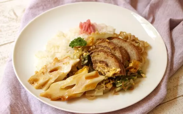 「車麩のすき焼き風」を煮詰める前に卵をといて加え、ご飯に添えればさらにボリューム満点などんぶりのできあがり!車麩と卵のトロトロふんわり食感に、さっぱり紅しょうががよく合います。