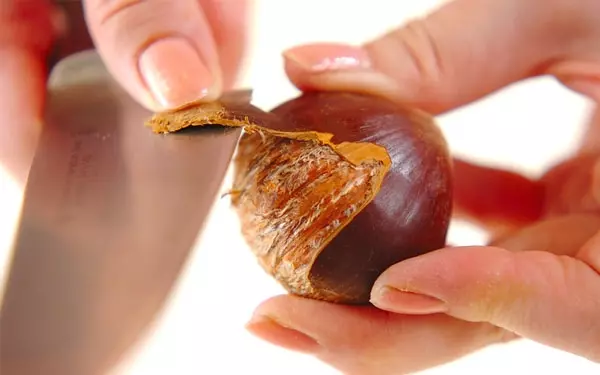 栗はザラザラした側から、栗むき用の包丁ばさみで栗に傷を付けないように外側の固い皮をむく。むいた栗は鍋に重曹とかぶるくらいの水を加えて半日以上つけておきます。