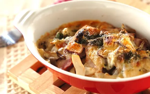秋の味覚を楽しむオーブン料理、キノコとベーコンのチーズ焼き