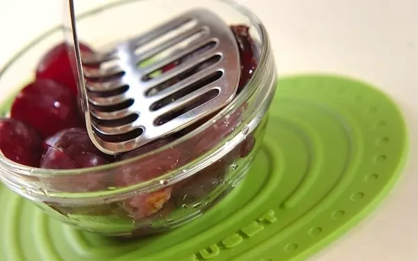 1、ブドウは半分に切り、マッシャーで軽くつぶす。カップは、分量外の熱湯で温めておく。