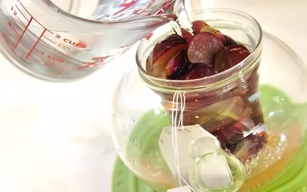 2、ティーポットにブドウと紅茶を入れて、熱湯を注ぐ。バットに分量外の熱湯を入れて、ティーポットごと2~3分温めて蒸らす。