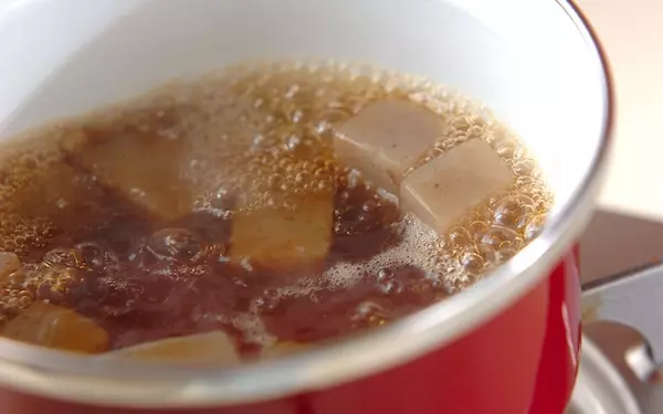 1、コンニャクは下ゆでして臭みを取り、食べやすい大きさに切り、鍋で乾煎りする。全体的に表面が焼けたら、<煮汁>の材料を加え、煮汁が少なくまで約10分煮る。