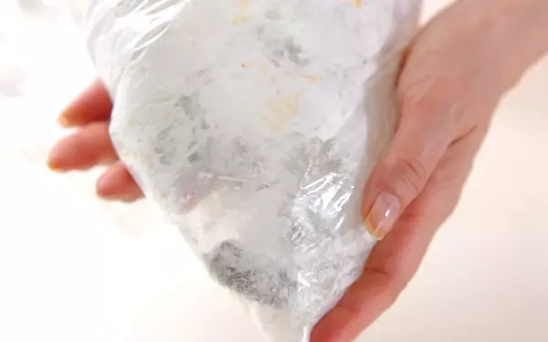 2、ビニール袋に小麦粉と片栗粉を入れてよく混ぜ合わせ、1の粗熱を取ったコンニャクを入れて、よくからめる。