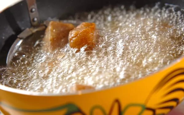 3、揚げ油を170℃に熱し、2のコンニャクの余分な粉をおとしながら入れていく。表面がカリッとするまで揚げ、器に盛り、お好みで練りカラシを添える。