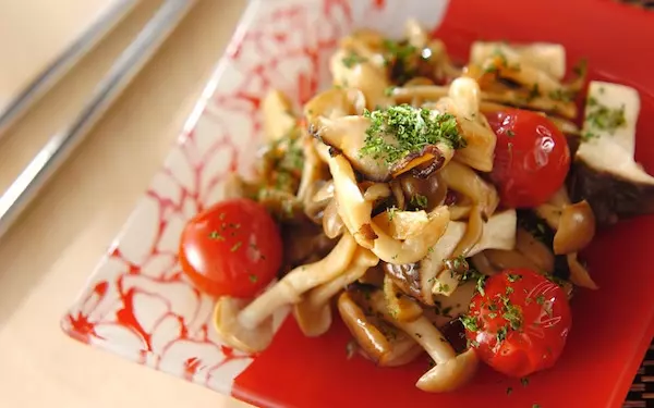 時間のないときでも簡単にできるのがこちらのレシピ。エリンギ、シメジ、生シイタケをカットし、フライパンを熱して、キノコを乾煎りし、しんなりしてきたところで、調味料を加えます。さらにプチトマトを加え炒め合わせたら、しょうゆを加えて全体にからめれば完成です。器に盛りつけた後、お好みでパセリを振りましょう。