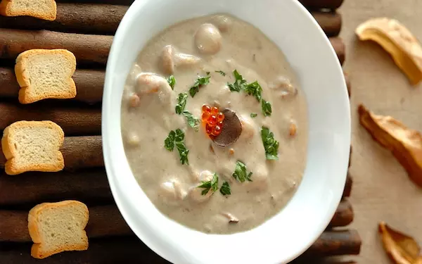 パンとの相性がバツグンなキノコのポタージュ。まったりとした食感とキノコの香りを楽しめる一品です。このレシピで使用するキノコは、乾燥ポルチーニ茸とマッシュルーム、ホワイトシメジ、ナメコ。一度に4つのキノコの風味を堪能できます。