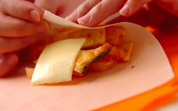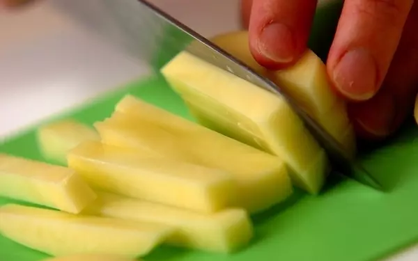 1、ジャガイモは5mm角のスティック状に切り、水にさらす。エリンギは縦と横に2等分して薄切りにする。スライスチーズは4等分に切る。