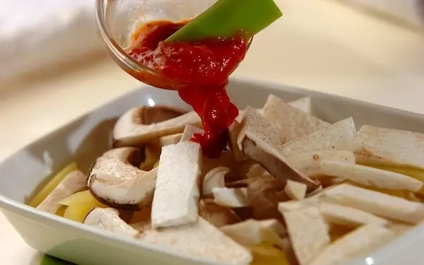 2、耐熱容器にジャガイモを入れてラップをし、電子レンジで1分加熱する。エリンギと塩コショウを加えて30秒加熱する。ミートソースを加えて、冷ます。