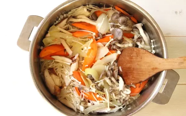 2、鍋にオリーブオイルを入れて弱火で熱し、ニンニクと玉ねぎを炒める。香りが立ったら中火にしてにんじん、きのこと塩を加えてキノコがしんなりするまで炒める。