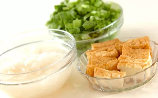 1、厚揚げは沸騰した湯にくぐらせて油抜きをし、半分に切ってさらに幅1cmに切る。カブは皮を厚めにむき、すりおろす。葉がついている場合は、適量を小口切りにする。