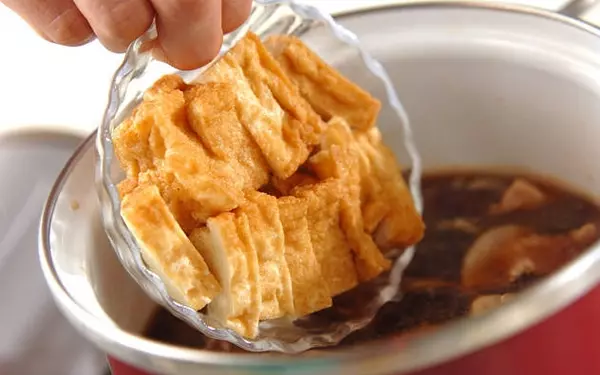 2、豚肉はひとくち大に切り、<下味>の材料をもみ込む。鍋にサラダ油をひいて火にかけ、豚肉を炒める。色が変わったら、<調味料>の材料を加えてひと混ぜし、厚揚げを加えて落とし蓋をし、10分位煮込む。