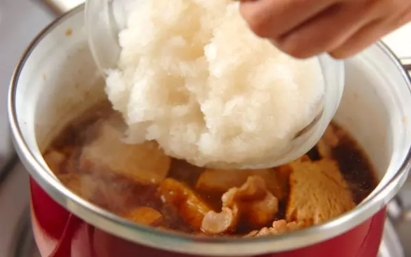 3、すりおろしたカブを加え、さらに2~3分煮る。器に盛り、あればカブの葉を散らしてユズの皮をのせる。