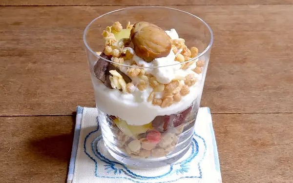 3、グラスにシリアル、焼き芋、水切りヨーグルト、焼き芋の順に盛り、むき栗をのせる。