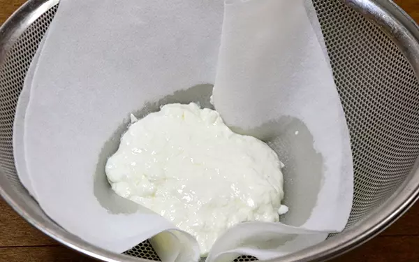 1、ボウルにざるを重ね、キッチンペーパーを2枚敷いてヨーグルトをのせて30分以上おいて水気を切る。