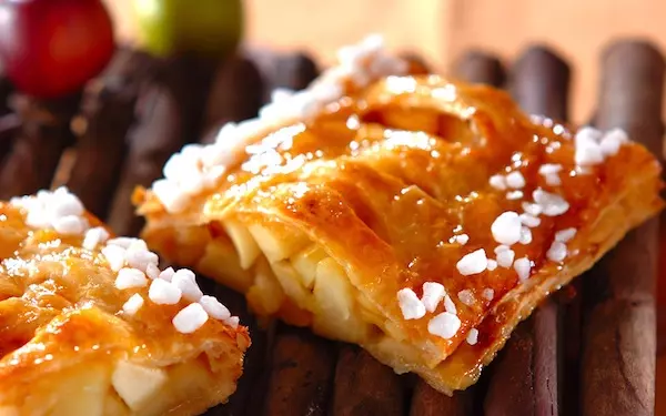 柿がない場合は、リンゴだけを使ってアップルパイにするのもいいでしょう。表面はサクサク、内側はしっとりとしていて甘酸っぱく、子どもから大人まで大満足の一品です。パイが焼きあがってから、お好みで表面にアプリコットジャムをぬったり、パイの両側にワッフルシュガーをのせていただきましょう。